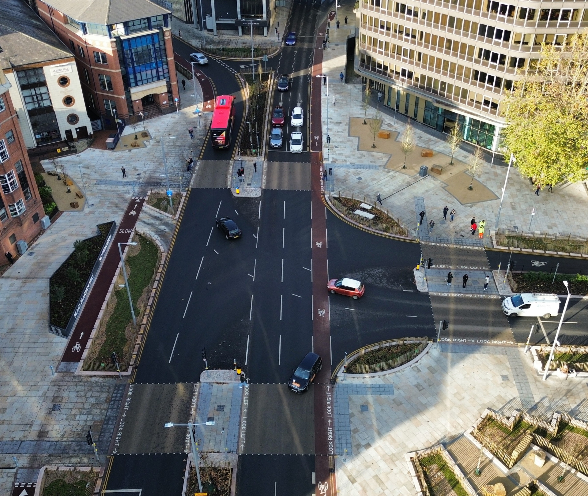 Client: Nottingham City Council The Maid Marian Way improvement project in Nottingham is a significant urban development aimed at enhancing safety and connectivity for pedestrians and cyclists. The £12 million project involves replacing the existing roundabout at the junction of Maid Marian Way, Derby Road, and Upper Parliament Street with a signal-controlled T-junction. This change is designed to improve traffic flow and make crossing easier for pedestrians, while also creating new cycle facilities and planting 41 native trees around the junction, quadrupling the area's green space. This project, funded by the Future High Streets Fund, will also introduce a rain garden to manage stormwater sustainably. Services we provided Civil & Infrastructure Engineering Project, Cost & Commercial Management Transport Planning & Traffic Engineering Our Role BWB provided a comprehensive suite of services for West End Point, including the design of the general junction layout, highway alignment, and active travel elements. Our team’s initial master planning and subsequent detailed designs helped transform the junction into a more connected, pedestrian-friendly space. Masterplanning Our team’s initial master planning and subsequent detailed designs helped transform the junction into a more connected, pedestrian-friendly space. We also developed traffic models and simulations to assess the impact of the new scheme on traffic flow and pedestrian movement, enabling local authorities to approve the works. Project management Our involvement extended to project management and day-to-day coordination, ensuring that the project progressed on schedule and met all key milestones. We were also responsible for landscape design, creating a series of options that integrated green spaces with the new junction layout. Unchartered caves During construction, uncharted caves were discovered beneath the project site. Our team conducted site investigations and devised remedial works to stabilise the ground, allowing the project to continue with minimal disruption. Additionally, the project required detailed consultations with local bus operators to identify new stop locations and manage changes in traffic patterns.