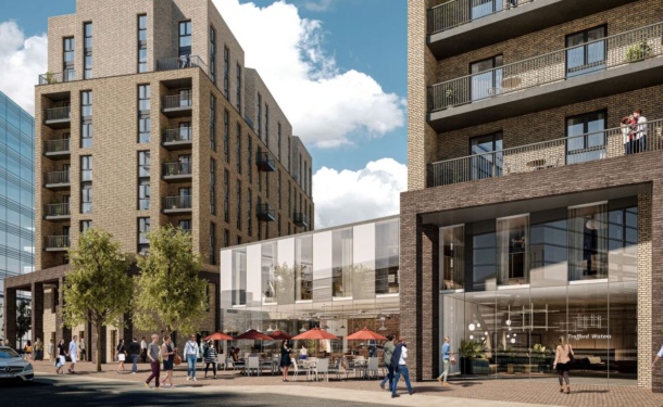 Trafford Waters is a 21-acre mixed-use development adjacent to the Manchester Ship Canal and close to the Trafford Centre.